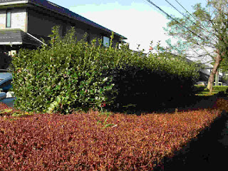 入口右手の生垣は、「ドウダンツツジ」と「サザンカ」です。
